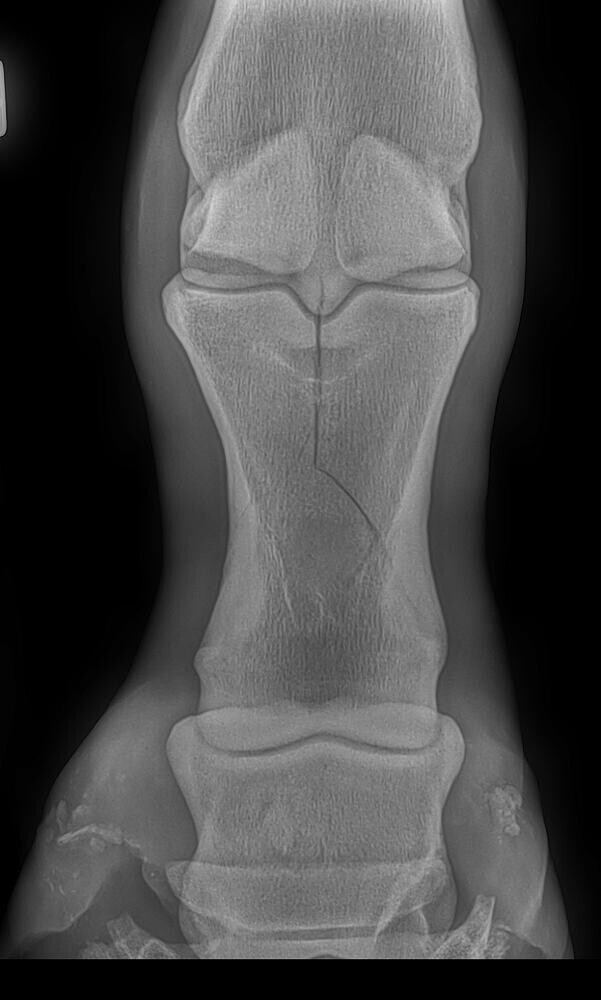 However, luckily there are some breaks that we can fix. Incomplete cracks where the bone is not displaced like cannon bone or pastern fractures are among the commonest fractures we repair. Figure 5 shows a simple pastern fracture. The finished repair is seen in Figure 6. Some of the complex fractures in foals that have a smaller bodyweight are amenable to the more commonly available bone plates. Some fractures like pedal bone breaks heal very well with just confinement.