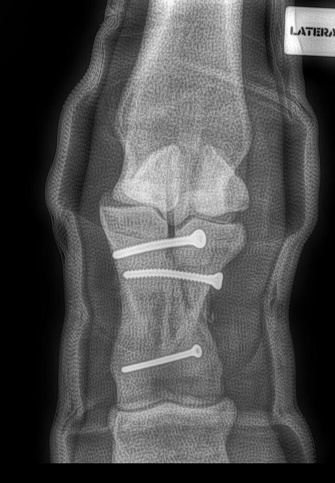 The repair of the fracture shown in Figure 2 was performed on a standing horse. The finished repair is in Figure 3. Figure 4 shows standing screw placement into a knee fracture.
