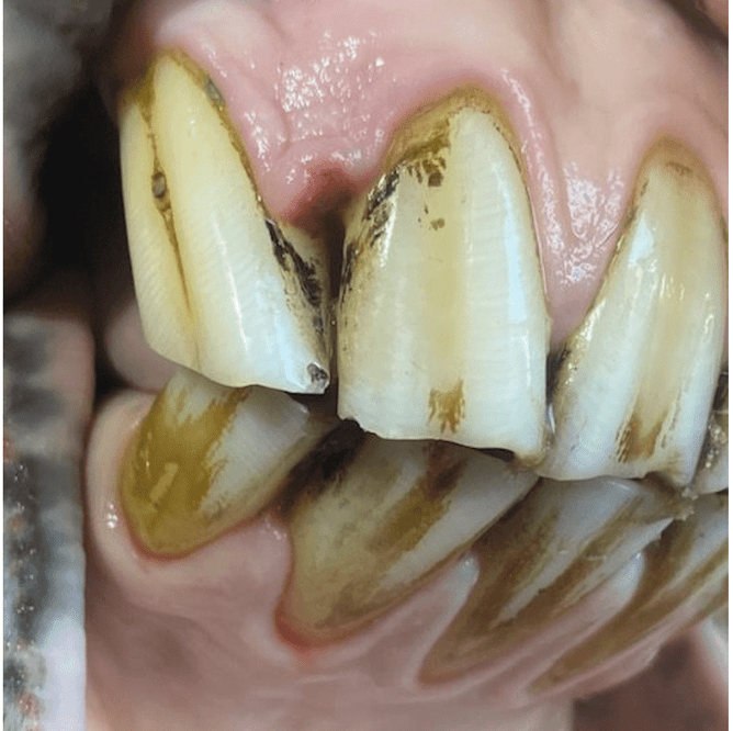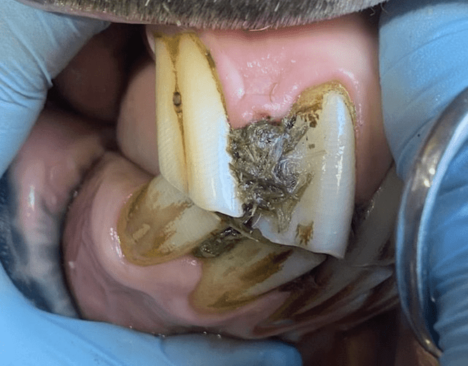 Luckily for this guy, his front tooth has been cleared of grass and, with regular checks and at-home flushing, this painful, damaged area can be taken care of.