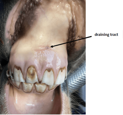 Clinical signs can range from mild to severe and this disease is degenerative as horses age. Incisor gum recession, caries, fractures and draining tracts (which can appear only as a small pinpoint) are all signs of EOTRH.