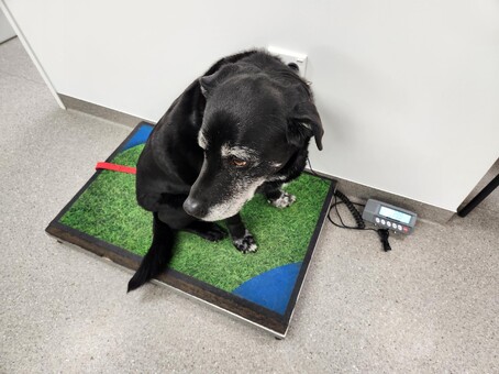 Dumper sat politely on the scales in the waiting room to be weighed, and this weight was kept on his file for future reference.