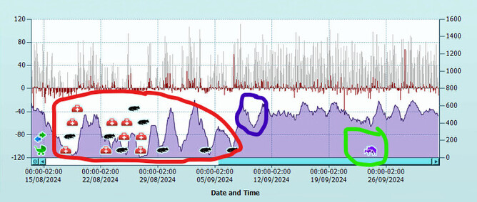 Looking at her rumination graph (pictured below), you can see circled in red the period of recurrent rumination drops and unsuccessful antibiotic treatments. She had surgery on the day highlighted in blue. Since then her rumination has stabilised and she even had her first heat recently, indicated in green.