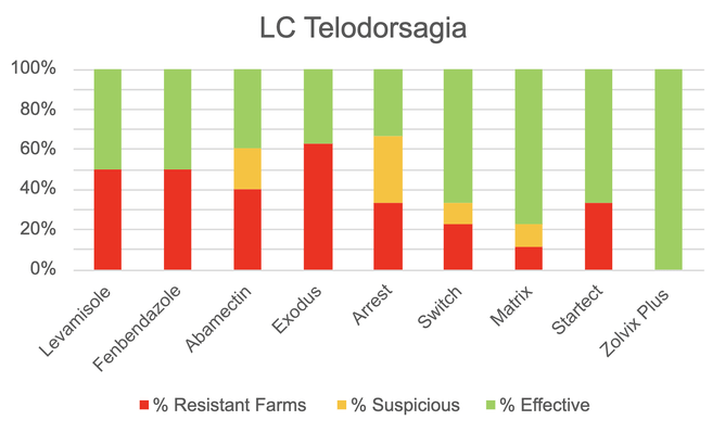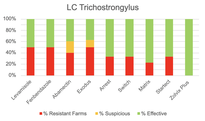 Unfortunately, we noted the most resistance across both Trichostrongylus and Teldorsargia (formerly Ostertagia) worm species, as shown in the graphs below.