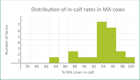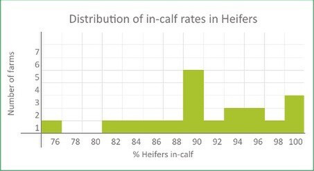 The graph below illustrates the distribution of in-calf rates among heifers. Across the sample, the average in-calf rate was 92%, though results varied widely. Encouragingly, around one-third of farms achieved in-calf rates of 95% or higher – which is an amazing outcome.