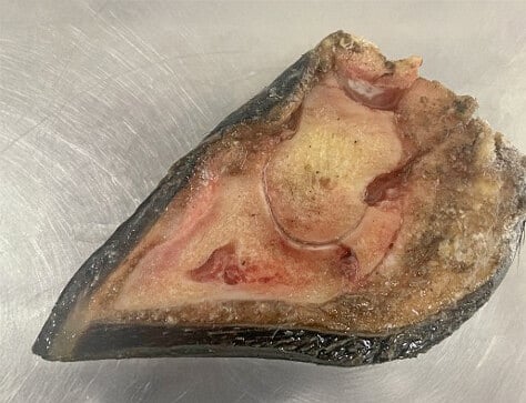 You can also see how easy it would be to over-trim the sole, particularly when using a grinder. Taking a couple of millimeters too much off could leave a very thin sole, with more potential for stones to penetrate through to the sensitive tissue underneath.