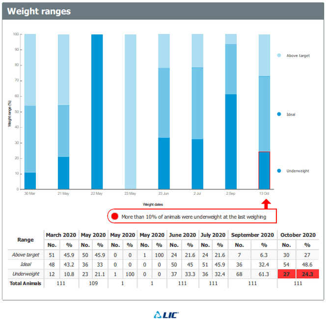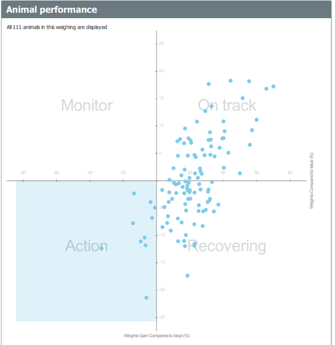 All weights can be uploaded to MINDA directly, a summary email is sent with results and MINDA graphs showing where the calves are sitting on the target line and the percentage of animals in the ideal or above weight range.