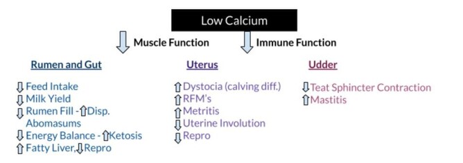 The ‘Why’- Let’s first appreciate how far reaching low calcium in a cow can be. All muscles require calcium to function normally, all bodily functions are impaired when calcium levels are less than adequate. As well as muscle function, their immune system also uses calcium in it’s defense against infection and disease at calving time.