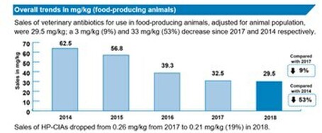 Total AMU now stands at 29.5mg/kg (Population Corrected Unit) for 2018. Note that in NZ, our total AMU is around 10-11mg/kg PCU. The decrease over recent years has largely been down to the co-ordinated effort of every food sector improving the way antimicrobials are used and focusing on improving animal health (e.g. sales of cattle vaccines have increased by 20% since 2011).