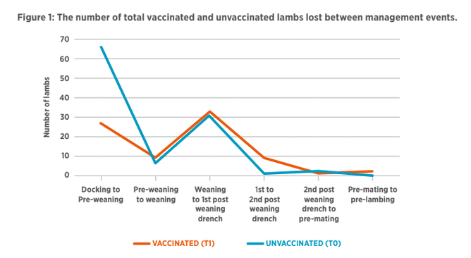 The total percentage of lamb losses from docking to pre-lamb was 6.2% and 4.8% in the unvaccinated and vaccinated lambs respectively (p=0.06). This is a 23% reduction in overall lamb deaths between the two groups.