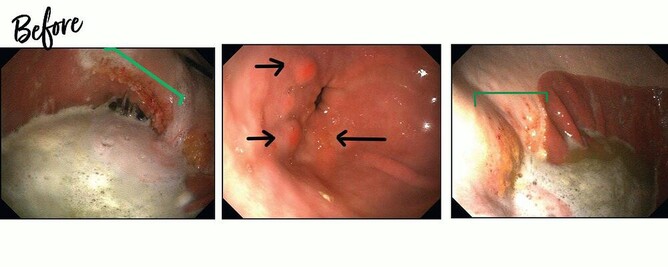 Grade 2-3/4 ulcerations were seen on the greater and lesser curvature of the stomach (EGSD) and there were raised, inflamed nodules surrounding the pylorus (EGGD).