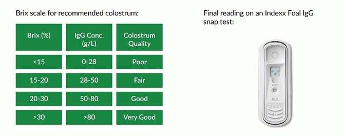 If your mare has excess colostrum, you can also freeze some in case you need it for another foal. Above 24% on the colostometer/refractometer is recommended.