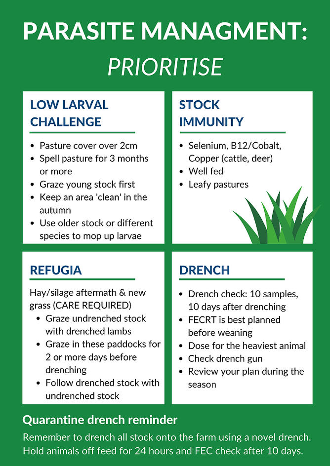 Below is a list of things to prioritise and avoid in relation to parasite management when planning your farming activities. Staying on the ‘prioritise’ list will boost your production and help protect the effectiveness of drenches so your farm is sustainable in the long run.